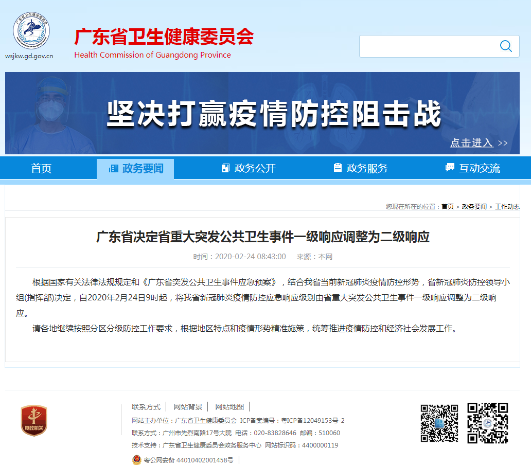 復工通知-廣東衛健委突發公共衛生事件一級響應調整為二級響應